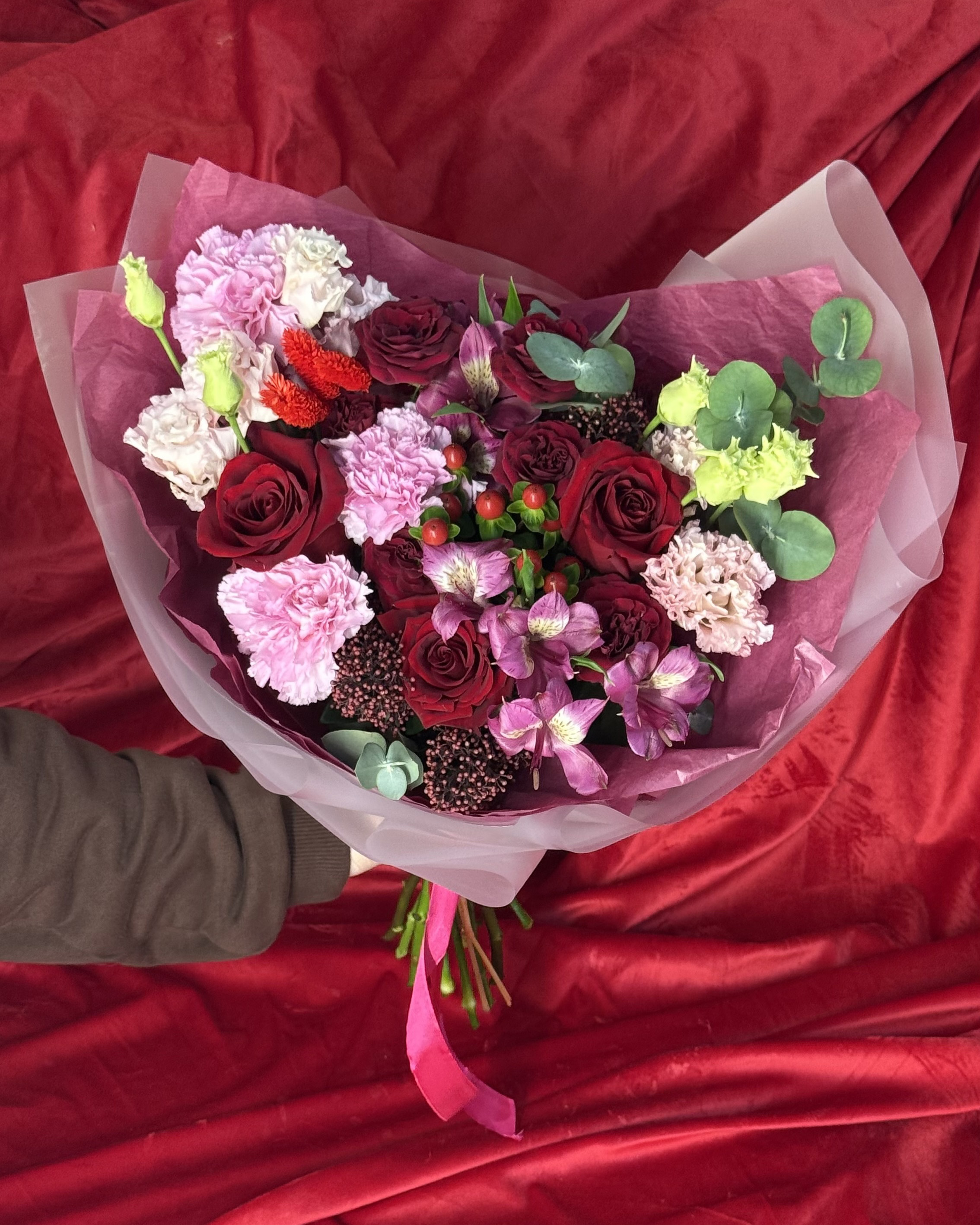скиммия, альстромерия, диантус и гиперикум — все это в стильной и гармонично подобранной упаковке.