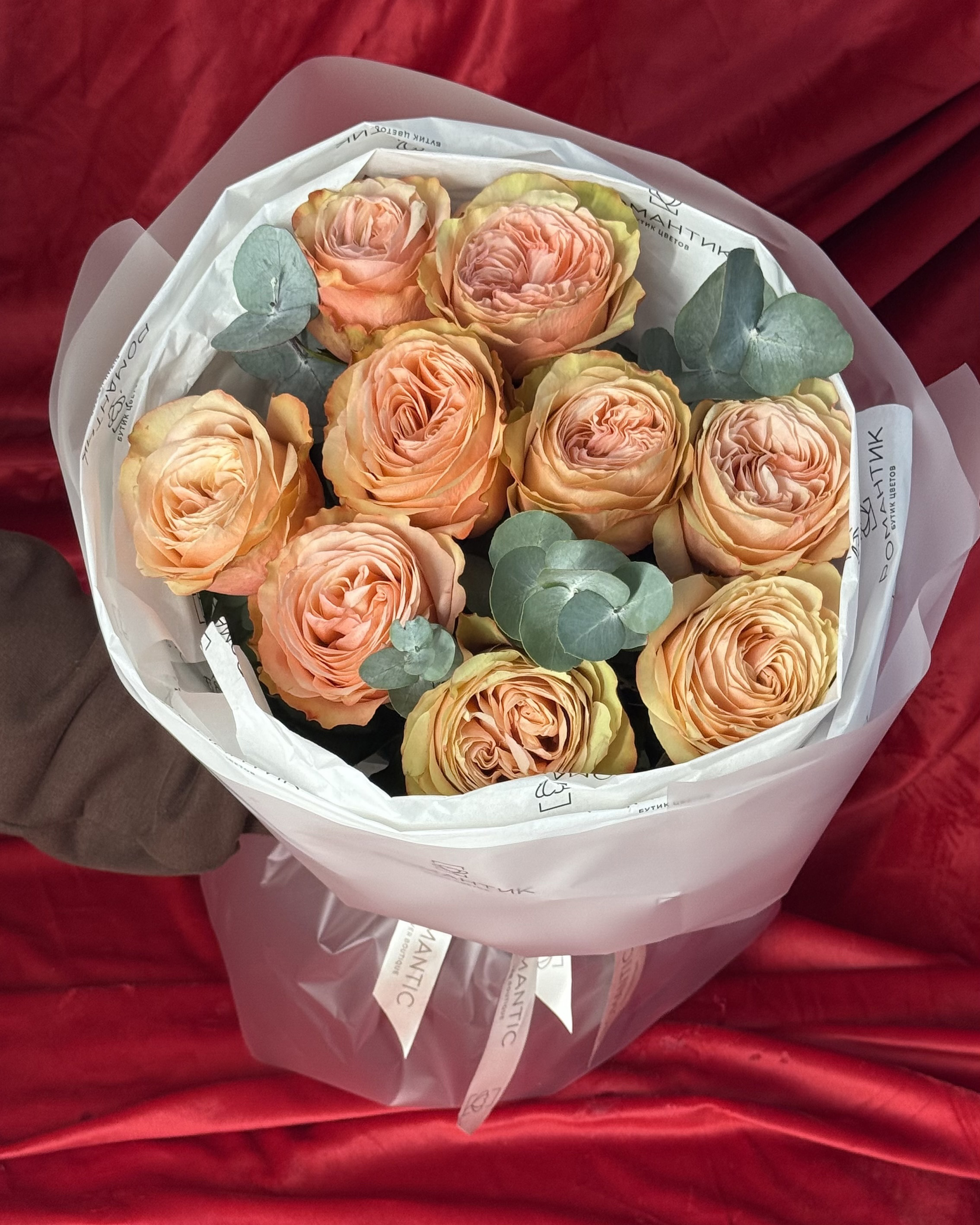 Шикарный букет из 9 пионовидных роз персикового оттенка с ароматным эвкалиптом в упаковке.