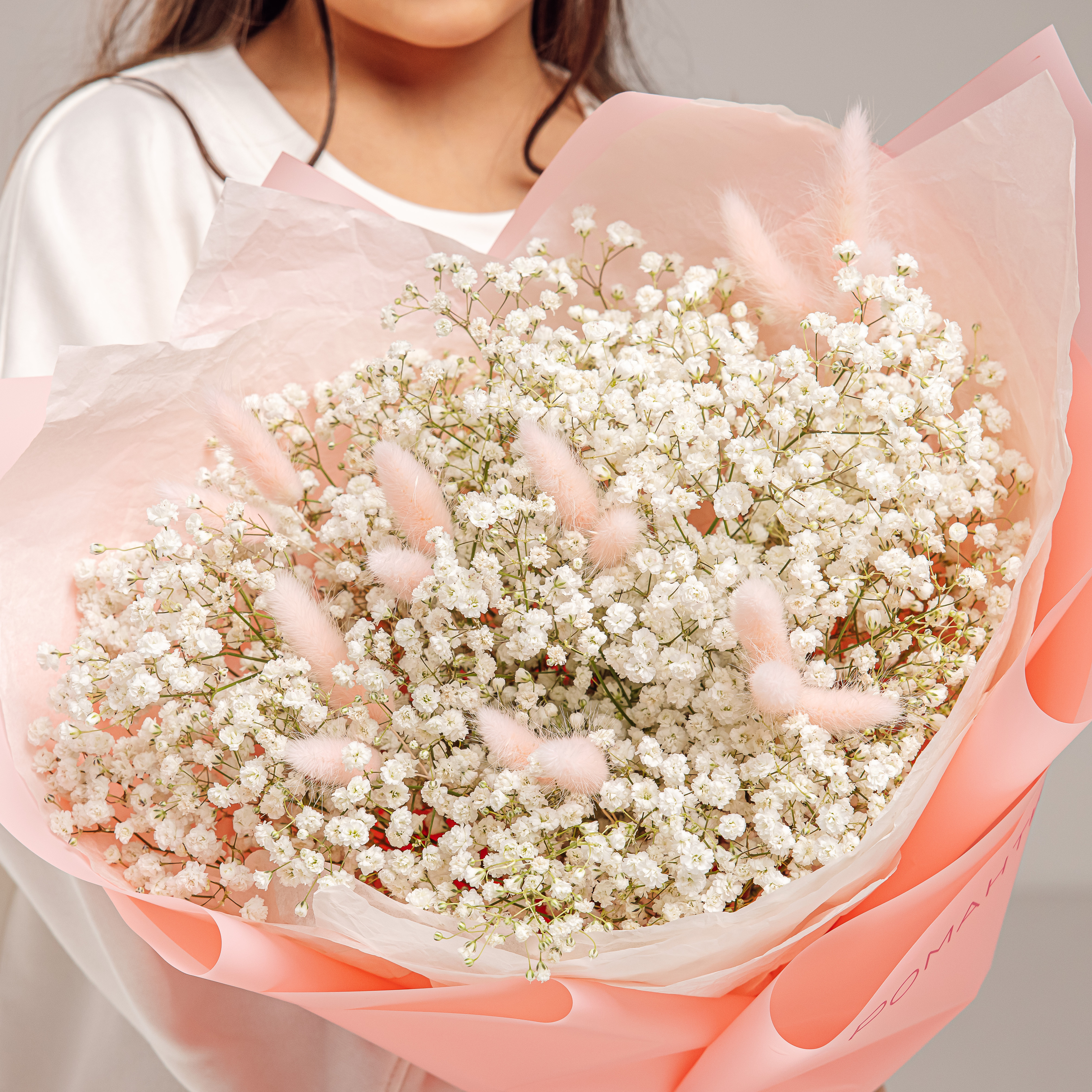 Букет из белой гипсофилы с лагурусом.