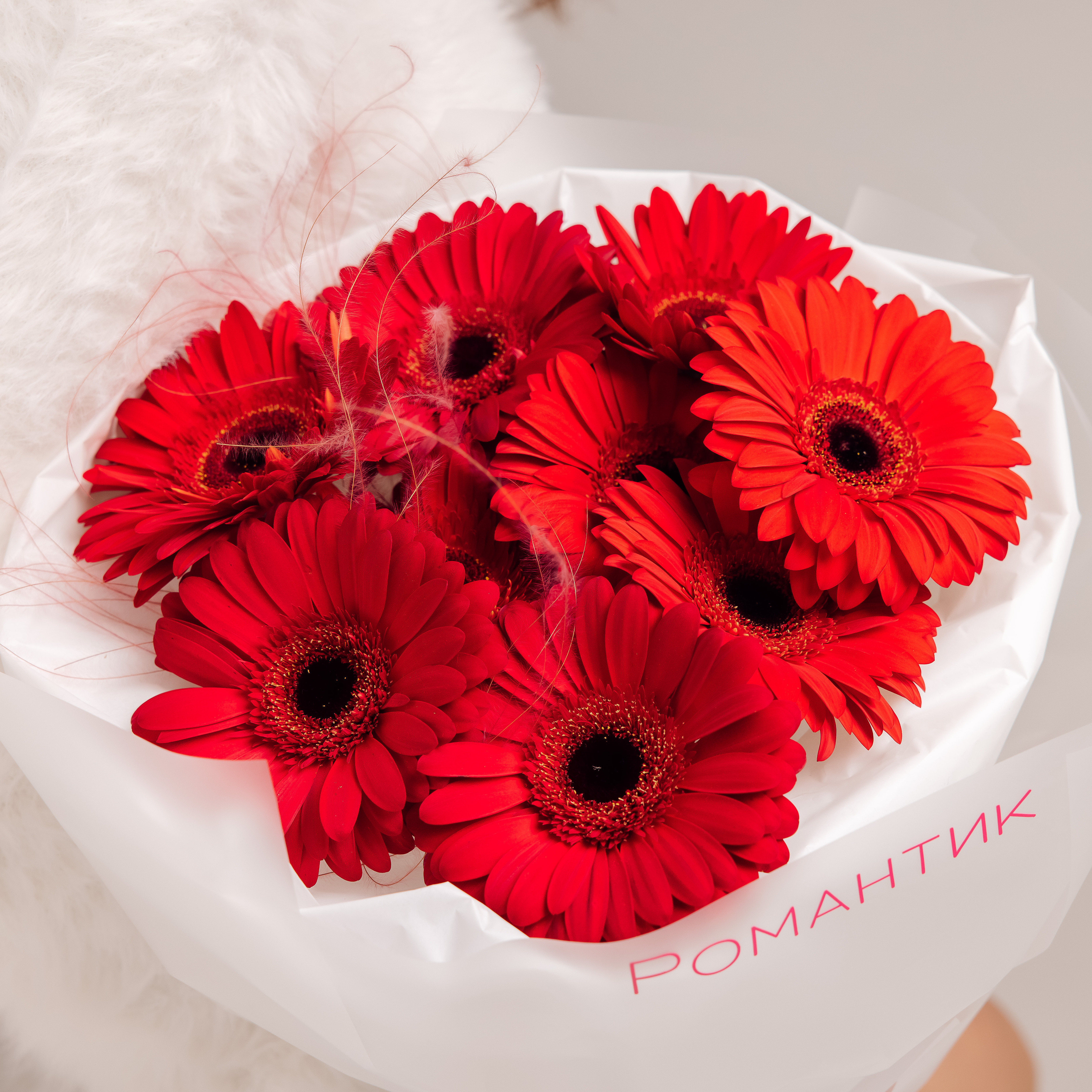 Моно букет из гербер Состав: Гербера - 9 шт. Стифа (сухоцвет) - 2 шт.